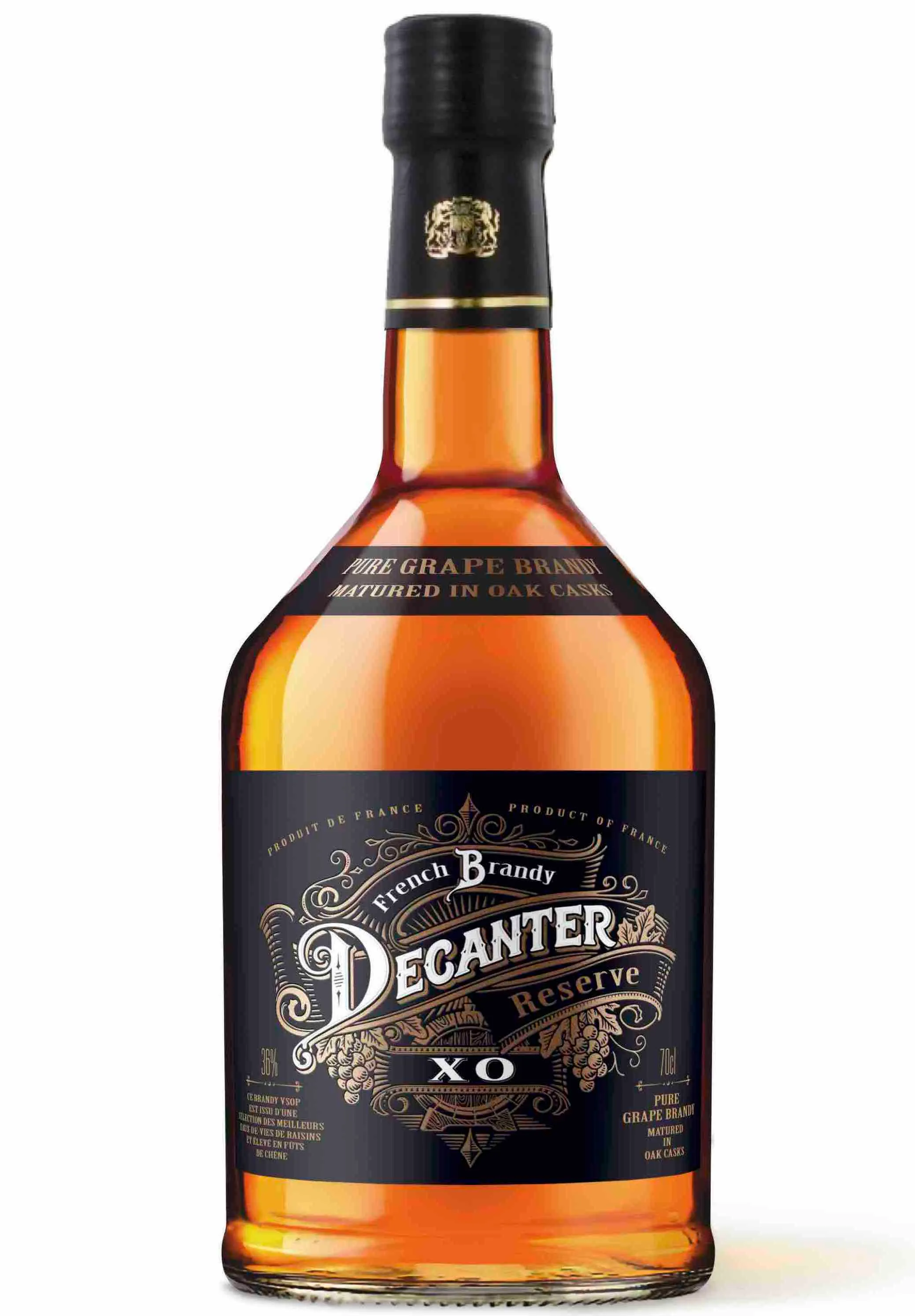 Riche et complexe, Decanter Reserve XO constitue le summum de la gamme. Élaboré à partir d'eaux-de-vie soigneusement mûries et vieilli plus longtemps en chêne français, il révèle des notes profondes de figue, de noix, de cuir et d'épices, enveloppées dans une texture veloutée. La longue finale reflète la patience et la maîtrise derrière sa création, véritable signature de la sophistication du brandy français.